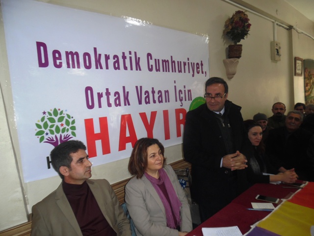 Toplantıya katılan yurttaşlara referandumda “Hayır” demenin önemine dikkat çeken Milletvekili Mehmet Emin Adıyaman de, “Bu referandum süreci 90 yıl boyunca bizim ve Türkiye halklarının kaderini belirleyecek. Biz Kürtler için ‘Hayır’ın iki anlamı var. ‘Hayır’ demekle iki cevap vermiş olacağız; Türkler ve diğer halklar olarak yaşayacağımız ortak vatanda cuntaya ‘Hayır’ birinci cevabımız olacak. Kürdistan’da Kürt düşmanlığı üzerinden yürüttüğü savaşı onaylamadığımızı ‘Hayır’ diyerek göstereceğiz. Şu iyi bilinmeli bu süreçte herkesin ‘Hayır’ı kendine. Herkes kendi gerçekliğinde kendi haklı gerekçesiyle ‘Hayır’ demeli” dedi.