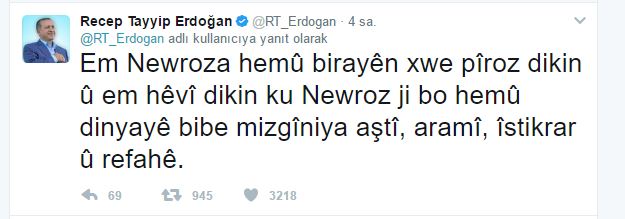 Cumhurbaşkanı erdoğan bugün Kürtçe olarak yayınlanan mesajında “Newroz” diyerek başladığı kutlama mesajında şöyle dedi;