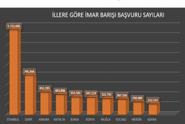 İmar Barışı rakamlarını il il değerlendiren Çatalkaya, İmar Barışı’na en çok başvurunun İstanbul’dan yapıldığını söyledi. Çatalkaya, “İmar Barışı’nda ilk sırayı 1 milyon 722 bin 696 başvuru ile İstanbul aldı. İkinci sırada ise 795 bin 934 başvuru ile İzmir yer alıyor. Üçüncü sırada yer alan Ankara’da 452 bin 295 başvuru yapıldı. Başvuru sıralaması Antalya, Bursa, Konya, Muğla, Kocaeli, Mersin ve Adana olarak devam ediyor.” dedi.