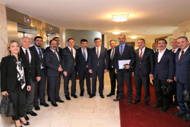 Feyzioğlu ve baro başkanları ilk olarak Meclis Başkanı Şentop'u ziyaret etti. Şentop, Feyzioğlu ve baro başkanlarıyla Divan Salonu'nda görüştü.