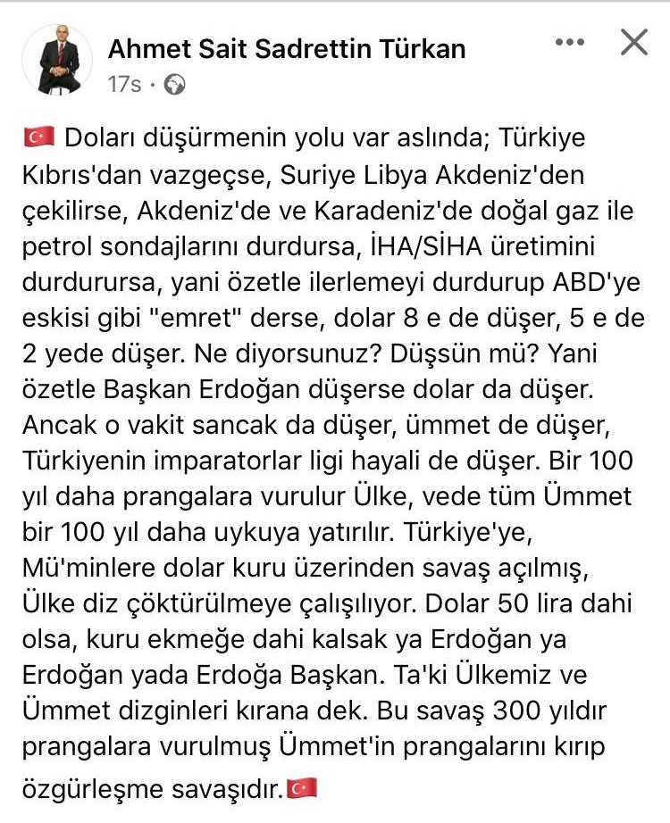 "Doları düşürmenin yolu var aslında; Türkiye Kıbrıs’tan vazgeçse, Suriye Libya Akdeniz'den çekilirse, Akdeniz'de ve Karadeniz'de doğal gaz ile petrol sondajlarını durdursa, İHA/SİHA üretimini durdurursa, yani özetle ilerlemeyi durdurup ABD'ye eskisi gibi "emret" derse, dolar 8 e de düşer, 5 e de 2 yede düşer. Ne diyorsunuz? Düşsün mü? Yani özetle Başkan Erdoğan düşerse dolar da düşer. Ancak o vakit sancak da düşer, ümmet de düşer, Türkiye’nin imparatorlar ligi hayali de düşer. Bir 100 yıl daha prangalara vurulur Ülke, ve de tüm Ümmet bir 100 yıl daha uykuya yatırılır. Türkiye'ye, Mü'minlere dolar kuru üzerinden savaş açılmış, Ülke diz çöktürülmeye çalışılıyor. Dolar 50 lira dahi olsa, kuru ekmeğe dahi kalsak ya Erdoğan ya Erdoğan ya da Erdoğan Başkan. Ta'ki Ülkemiz ve Ümmet dizginleri kırana dek. Bu savaş 300 yıldır prangalara vurulmuş Ümmet'in prangalarını kırıp özgürleşme savaşıdır."