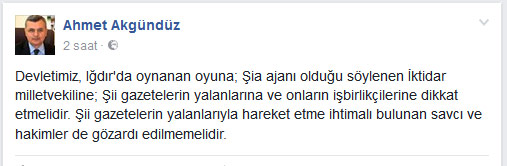 "Devletimiz, Iğdır'da oynanan oyuna; Şia ajanı olduğu söylenen İktidar milletvekiline; Şii gazetelerin yalanlarına ve onların işbirlikçilerine dikkat etmelidir. Şii gazetelerin yalanlarıyla hareket etme ihtimali bulunan savcı ve hakimler de gözardı edilmemelidir."