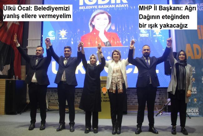 Ak Parti Iğdır Belediye Başkan Adayı Ülkü Öcal tanıtım toplantısında yaptığı konuşmada: “Bugün bizim için coşkulu bir gün ilçe ve beldelerimizin adaylarını tanıtıyoruz. Iğdır Sevdalıları burada, 2024 Yılında Iğdır Türkiye yüzyılında gerçek belediyeciliği yaşayacaktır. , 20 Yıllık bir tecrübe ile belediye başkanı seçildiğim takdirde Iğdır kalkınmada yatırımda çağ atlayacaktır. Yeter ki belediyemizi yanlış ellere teslim etmeyelim.” dedi.