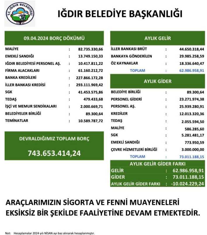 Daha sonra gerçekleştirilen toplantıda Mali işlerden sorumlu Belediye Başkan yardımcısı Nevzat Kesemen, Iğdır Belediyesinin kayyum yönetiminden kalan borçlarının 743.653.414.24 olduğunu gelir ve gider tablosunda ise belediyenin aylık gelirinin 62.986.958.91 olduğunu giderinin ise 73.011.188.15 olduğunu aylık gelir gider arasındaki farkın -10.024.229.24 olduğunu açıkladı.