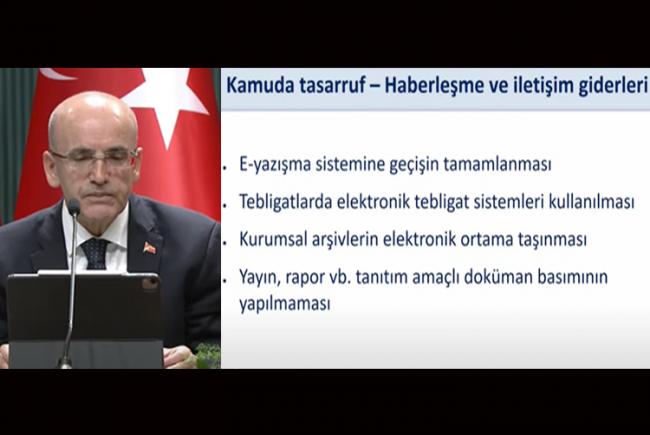 Cumhurbaşkanı Yardımcısı Cevdet Yılmaz ve Hazine ve Maliye Bakanı Mehmet Şimşek, kamuda tasarruf dönemi için alınan tedbirleri açıkladı. Planlanan harcama tedbirlerinin üç temel ekseninde; kamuda tasarruf, bütçe harcamalarında disiplin ve kamu yatırımlarında verimlilik yer alıyor. Taşıt kullanımından kamu binalarına, istihdamdan idari yapılanmaya, yurt dışı görevlendirmeden enerji ve atık yönetimine kadar birçok tedbiri içeren kamuda tasarruf planında, “haberleşme giderleri” için alınan önlemler ise önemli bir yer tutuyor. Bu kapsamda; kamuda haberleşme ve iletişim giderlerinde dijitalleşme yoluyla tasarrufa gidilmesi planlanıyor. Öne çıkan haberleşme ve iletişim tedbirleri arasında; kamuda elektronik yazışmaya geçişin tamamlanması, fiziksel arşivlerin elektronik ortama taşınması ve elektronik tebligat sistemi kullanımının yaygınlaştırılması maddeleri yer alıyor. Tedbirler kapsamında; yayın, rapor ve benzeri tanıtım amaçlı dokümanlar da fiziki olarak değil elektronik ortamda paylaşılacak. Uygulanacak tedbirlerle birlikte bütçe açığı, faiz yükü, kamu borçlanması ve cari açıkta ciddi azalma olacağı öngörülüyor. Tedbirlere uyulmadığının tespiti durumunda Cumhurbaşkanlığı ve ilgili idareler, aykırılık yapan kuruma idari yaptırım ve para cezası uygulayabilecek.