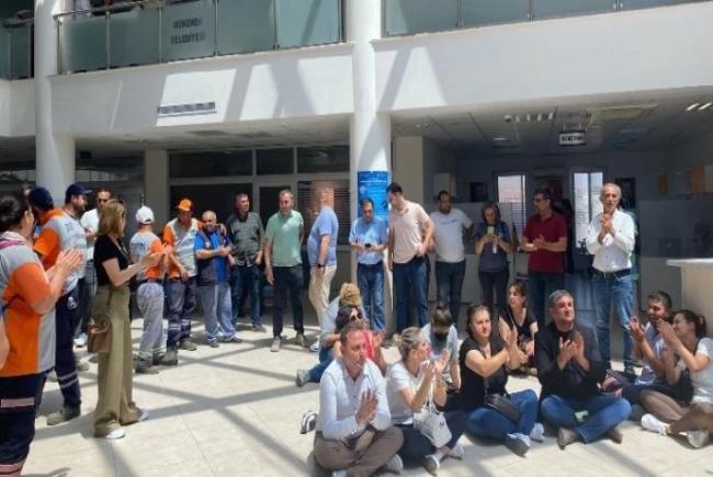 AKP'li Menemen Belediyesi, bu sabah yaklaşık 300 işçiyi işten çıkarttı. İşçiler belediye önünde oturma eyleme yaptı.